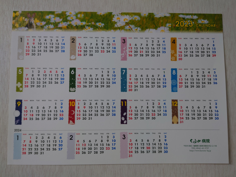 2023年🐰オリジナルカレンダーを作りました。 くるめ病院受付ロビーにて配布中です。どうぞご自由にお持ちください。 寒さも厳しい季節です。お風邪など召されませぬよう、一層ご自愛のうえ よいお年をお迎えくださいますようお祈り申し上げます。 くるめ病院 職員一同 くるめ病院ホームページ委員会2022-12-06T16:06:52+09:002022年12月6日|通常|