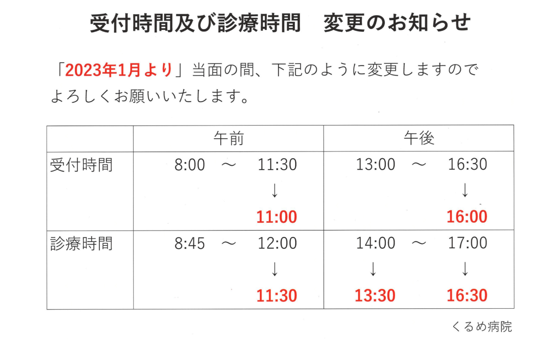 明日、1月4日から受付時間・診療時間が変わります。 電子カルテの受付時間を過ぎると、午後の診療や時間外へ変更となりますので、時間に余裕をもって、ご来院ください。 なお、女性外来および荒木医師の予約診療については、受付時にお知らせください。 くるめ病院ホームページ委員会2022-12-30T20:59:55+09:002023年1月3日|通常|