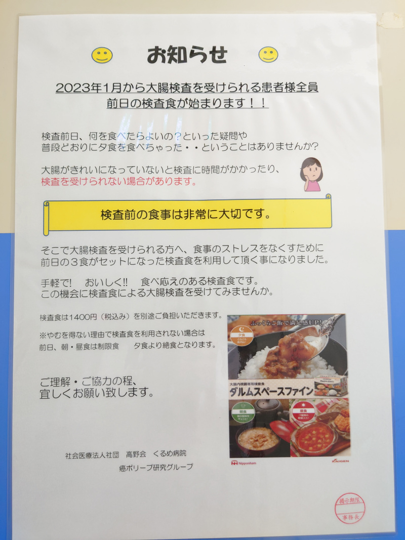 全大腸内視鏡検査前の食事について 2023年1月から検査食が始まりました。 検査前の食事について悩んだり、つい食べたりして、大腸内がなかなかきれいにならずに、検査時間がかかってしまうなど、お困りの方も多いようです。 お手軽で、美味しいとのことです。 くるめ病院ホームページ委員会2023-02-10T11:10:02+09:002023年1月20日|通常|