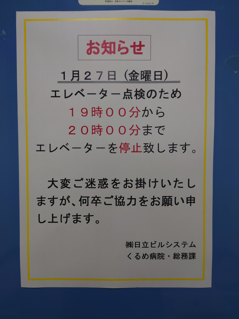 エレベーターのメンテナンスがございます。 点検のために、本日27日の19時から20時までエレベーターが停止いたします。 大変ご迷惑をおかけいたしますが、ご協力をお願いいたします。 くるめ病院スタッフは基本的には階段を使いますので、足腰鍛われます。(^^)/ くるめ病院ホームページ委員会2023-02-01T12:11:25+09:002023年1月27日|通常|