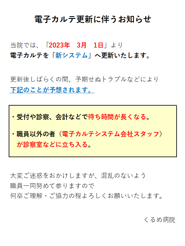 くるめ病院では、2023年3月1日より電子カルテシステムが新しくなります。