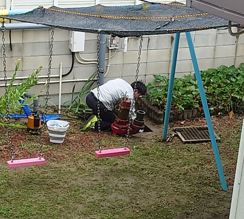 排水ポンプの調整中 梅雨の大雨で、2回ほど病院の中へ緊急避難したくるめ病院保育所。 幸い床上浸水しなかったのですが、ぎりぎり。 ポンプを設置した穴には泥がいっぱい。雨の中、お掃除していただいてます。 くるめ病院ホームページ委員会2023-08-17T16:12:51+09:002023年8月17日|通常|